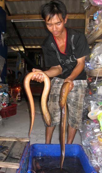 | Cặp lươn cực khủng được chủ nhân bắt lên cho khách mua hàng chiêm ngưỡng. Ảnh: