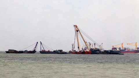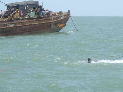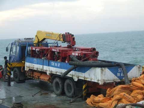 Máy bơm công suất lớn được xà lan chở ra hiện trường để hút nước trong thân tàu Trường Hải Star, phục vụ công tác trục vớt.