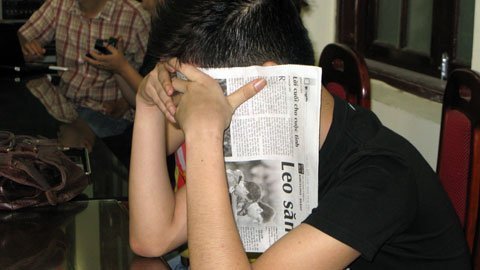 Tại cơ quan công an, “tú ông” này khư khư một tờ báo, che kín mặt, không để cho phóng viên chụp hình.