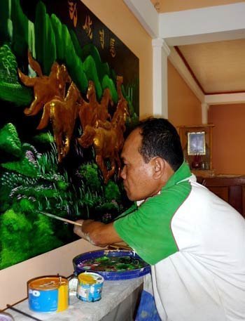 | Cặm cui chăm chút hoàn thiện bức sơn dầu ‘mã đáo thành công’ của người họa sĩ. |