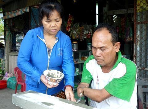 | Hình ảnh người vợ tần tảo sớm hôm giúp chồng phụ bưng hồ, tô khuôn đổ lam bằng thạch cao. |