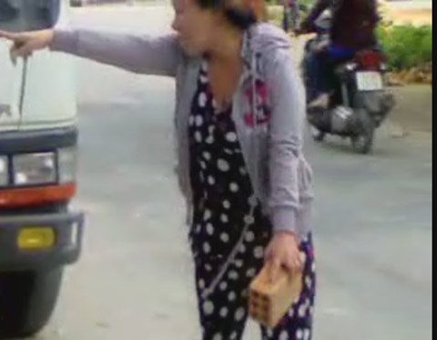 Một trong hai người phụ nữ cầm gạch ném về phía CSGT |