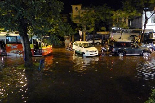 Tương tự, tại phố Nguyễn Khuyễn có những điểm nước ngập sâu quá bánh xe ôtô như đoạn trước cổng trường THCS Lý Thường Kiệt. Giao thông khu vực này tắc nghẽn, hỗn loạn vì các phố xung quanh đều bị “phong tỏa” do cũng bị ngập.