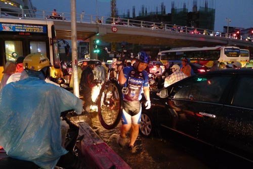 “Đi xe buýt cũng không thể vì quá đông. Giữa lúc mưa to mà mang xe máy ra đường thì cả người lẫn xe sẽ đều chôn chân trên đường. Vì thế, tôi đành chờ ở cơ quan còn hơn là ra ngoài”, chị Hà cho hay.