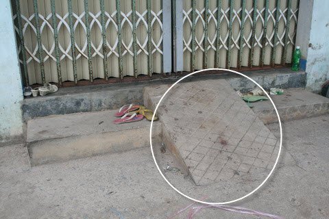 Cách căn nhà đang xây một căn là phòng trọ của mẹ con chị Thu Hà. Phòng trọ đã khóa kín. Trước bậc lên xuống nhiều vết máu còn đọng lại…