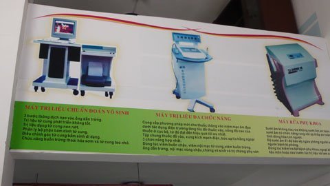 Điều đặc biệt ở đây nhiều máy móc được trưng bảng quảng cáo với chức năng rửa phụ khoa bằng ozone, máy điều trị nam khoa, máy tính…đều được dán giấy đề nội dung đang “chờ thẩm định”, dù máy móc này đều đã cũ, còn giấy dán thì mới tinh.