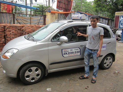 | Lái xe Mai Văn Tú bên chiếc xe taxi |
