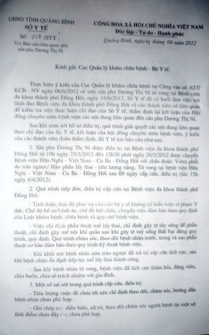 | Sở Y tế Quảng Bình Báo cáo về sai sót của Bệnh viện ĐK Đồng Hới liên quan đến sản phụ Dương Thị Ni gửi Cục khám chữa bệnh - Bộ Y tế. |