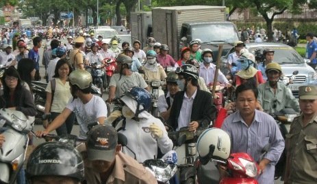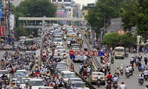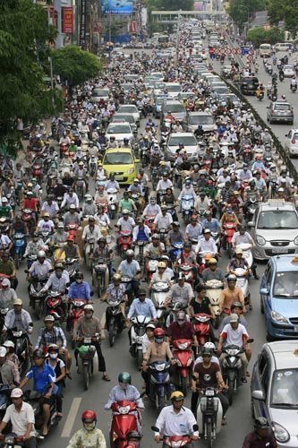 | Một nữ sinh kẹt giữa những xe máy khi băng đường qua làn có xe buýt lưu thông. |