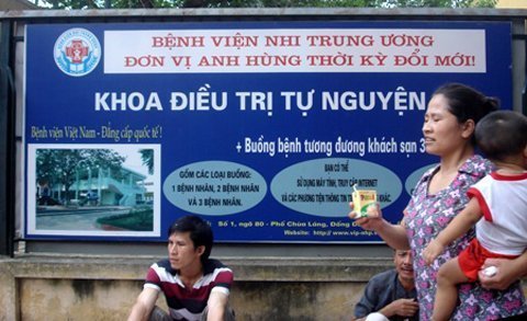 | Xã hội hóa y tế: Mỗi nơi một kiểu Khoa điều trị tự nguyện A (bệnh viện Nhi Trung ương) ra đời theo chủ trương xã hội hóa trong ngành y tế. Hiện nay, mỗi năm khoa khám cho khoảng 4.000 bệnh nhân ngoại trú, điều trị nội trú cho khoảng 400-500 bệnh nhân. Ngoài việc đáp ứng nhu cầu cho các đối tượng có khả năng thanh toán thì khoa cũng đã góp phần nhỏ trong công tác giảm tải bệnh viện. Lãnh đạo bệnh viện Nhi TW từ chối tiết lộ về khoản thu hàng năm do khoa này mang lại. Hiện nay, chủ trương xã hội hóa trong y tế đều được các cơ sở y tế thực hiện nhằm đáp ứng nhu cầu bệnh nhân và tăng nguồn thu cho bệnh viện. Tuy nhiên, chủ trương này hiện không được thực hiện thống nhất, mỗi nơi làm một kiểu. |