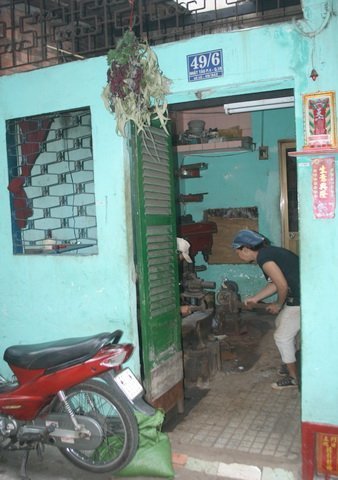 | Lò rèn của ông Lê Văn Châu trong xóm nghèo bên hông chợ Nhật Tảo. |