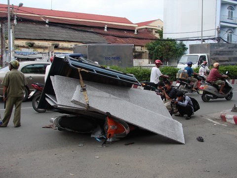 Chị Vy bị thương khá nặng được bà con chuyển đến bệnh viện cấp cứu. Tại hiện trường, chiếc xe ba bánh bị nghiêng chổng bánh lên trời. Xe gắn máy của chị Vy bị phủ gọn dưới 10 tấm đá granite.