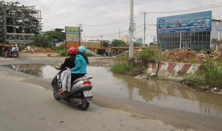 | Hướng đi từ ngã tư Thủ Đức vào trung tâm TP.HCM, xe máy phải vòng qua gầm cầu, mặt đường hiện rất xấu. |