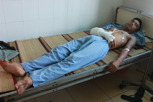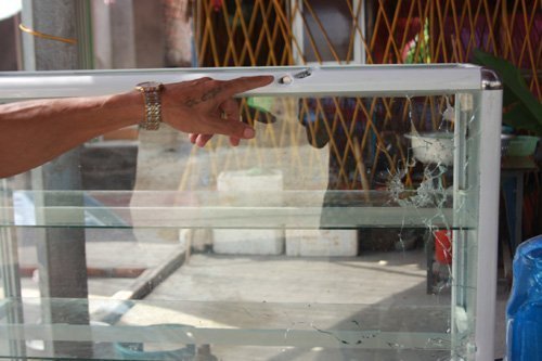 ![]() Cả nhà ông Năng đang ngồi ăn tại quán cơm của gia đình, bất ngờ bị 6 thanh niên đi trên 3 xe máy đi tới rút súng bắn thẳng vào ![]() ![]() Một nồi cơm điện bị bắn thủng ![]() Tủ kính đựng thức ăn cũng có nhiều vết đạn xuyên qua. ![]() Vết đạn trên thân cây chuối tại quán ![]() ![]() Theo các bác sỹ, L. bị thương khá nặng, nhiều viên đạn đã găm vào tay bên phải nên các bác sỹ chỉ mổ lấy được một viên to nhất, còn nhiều viên vẫn nằm trong tay nan nhân. ![]() Một nạn nhân nữ đang mang thai đã bị đạn găm vào phía sau lưng. ![]() ![]() |