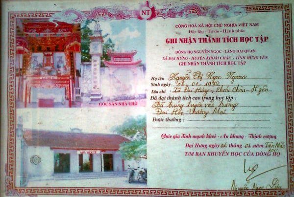 | Một tấm giấy khen của dòng họ giành cho người đỗ ĐH |