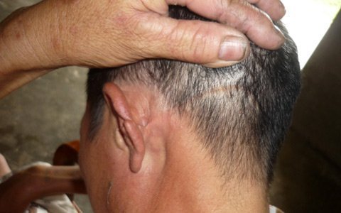 | Vết sẹo trên đầu ông Đảng, do anh trai trong một lần say rượu, đã cầm dao chém khiến em phải nhập viện, khâu 12 mũi. |