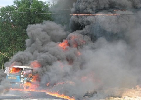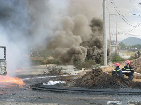 Ngọn lửa bùng cháy dữ dội bốc khói đen kịt. Đây là xe rải nhựa đường của công ty TNHH Mai Tiến Thành đảm nhận thi công tuyến đường dẫn vào chợ. Ngay sau khi nhận được tin báo, lực lượng cảnh sát Phòng cháy chữa cháy công an tỉnh đã huy động 3 xe cứu hoả đến hiện trường sau 5 phút.