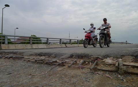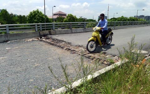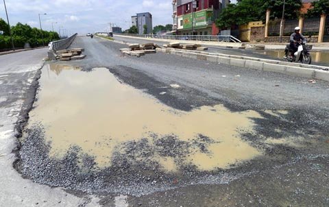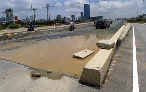 Ngày mưa cũng như ngày nắng, những hố voi tạo thành một ao nước. Mối nối giữa các nhịp cầu còn chơ sắt và có độ cao chênh lệch gần 20cm…
