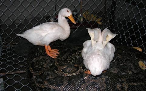 ![]() Cả 2 con vịt màu trắng làm mồi cho trăn, nhưng mặc nhiên trăn không thèm để ý. |