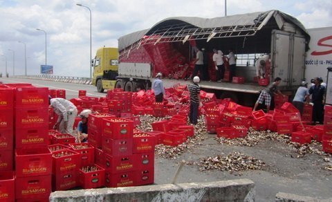 Tại hiện trường, bên cạnh đầu kéo 57L – 4717 kéo theo rơ-mooc chở hàng ngàn két bia chai nhãn hiệu Saigon là quang cảnh vô cùng hỗn độn. Hơn 2/3 số két bia trên xe đã ngã nhoài xuống đường vỡ toang. Nước bia chảy như suối trắng xóa cả mặt đường.