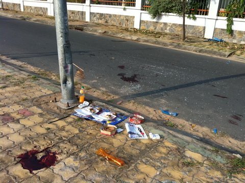 Hai phần lễ vật được đặt song song. Hai người với hai nén hương tỏa khói nghi ngút. Họ bắt đầu khấn vái. Chung quanh đó, nhiều vết máu đã khô. Nhiều mảnh vỡ, phụ tùng của chiếc xe máy và những hạt thủy tinh do chóa đèn bị vỡ vương vãi khắp nơi. Ở chân trụ điện, hai vết lõm còn mới tinh.