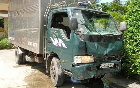 | Chiếc xe ôtô tải chở nước đá gây tai nạn được đưa về trụ sở công an |