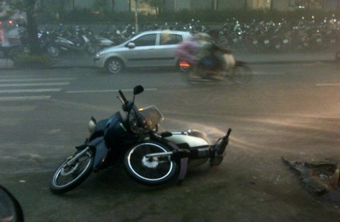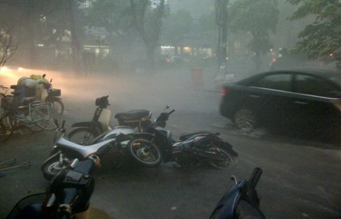 Nhiều người đi đường không kịp trú, gió tạt liệng cả xe vào lề đường. Một số xe máy, dù đã dựng chân chống ngay ngắn cũng bị tạt đổ.
