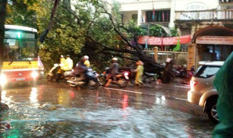 Trên phố Tây Sơn cũng có 1 cây đổ trước cổng Trường ĐH Thủy lợi. Trên phố Đào Duy Anh, trước cổng khách sạn Kim Liên có 2 cây lớn đổ chắn ngang đường khiến người tham gia giao thông phải đi đường vòng.