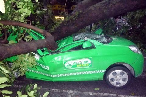 Cây đổ trên phố Lò Đúc đè bẹp xe taxi Mai Linh khiến tài xế tử vong. Một số xe máy dựng cạnh đó cũng bị đè bẹp. (Ảnh: Phạm Hải)