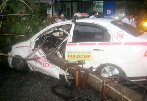 Giông bão giật mạnh khiến 1 cột điện trên phố Trần Huy Liệu xảy ra vụ đổ cột điện, đổ cây đè nát, bẹp dúm chiếc taxi. Rất may, nhân viên lái taxi là anh Nguyễn Phú Tuấn đã may mắn thoát chết, chỉ bị thương tích nhẹ do các mảnh vỡ cửa kính xe găm vào - ảnh Anh Tuấn