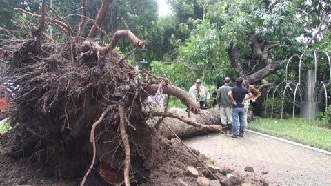 Lúc gần 10h sáng ngày 22/8, cây xà cừ cổ thụ trên đường Trần Nhân Tông, gần cổng chính của Công viên Thống Nhất, có đường kính thân hai người ôm đã bật gốc, dù thời tiết bình thường, trời nắng ráo, gió nhé.