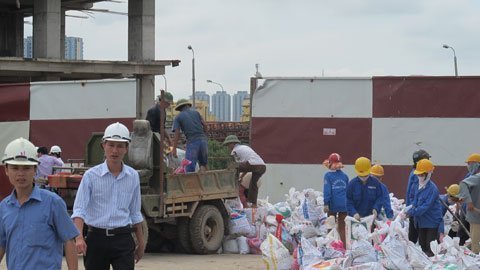 | Hàng trăm công nhân đang xúc cát vào bì làm bờ vây xung quanh "hố tử thần" để tiến hành thi công lại phần đường sụt lún. |