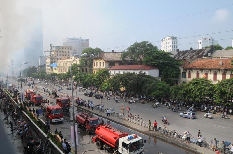 Tại hiện trường, hàng trăm người gồm các lực lượng PCCC, công an phường, dân phòng phối hợp cùng người dân sơ tán tài sản và phục vụ công tác chữa cháy. Giao thông quanh khu vực đã ùn ứ hai đầu tuyến phố Hồng Hà.