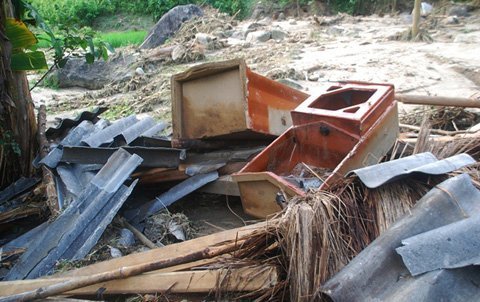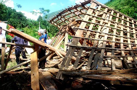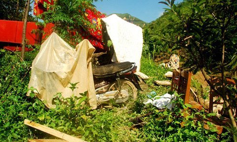 Ngay ở đầu thôn, chúng tôi gặp chị Lý Thị Nhộn, 29 tuổi, đang ngồi ôm đưa con nhỏ, bên ngôi nhà bị lũ quét đánh sập, trơ khung gỗ, đồ đạc vung vãi khắp nơi, bê bết bùn đất. Chị kể: “Đang ngủ, bất ngờ nghe thấy tiếng nổ vang, nước réo ầm ầm, đá lăn lục cục, tôi chỉ kịp thét lên đánh thức chồng, rồi hai tay túm hai đứa con nằm ngủ bên cạnh, lao ra ngoài trời mưa tầm tã, chạy ngược lên đồi cao, thoát chết trong gang tấc”.