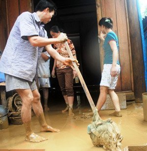 | Người dân khẩn trương khắc phục hậu quả lũ lụt. |