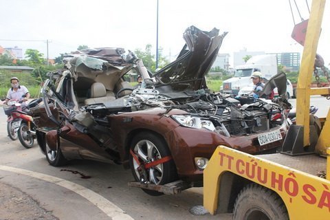 Những người chứng kiến vụ việc cho biết, xe du lịch đi từ cầu Phú Mỹ (quận 7) hướng về quận 2 khi đến giao lộ với liên tỉnh lộ 25B đã đâm thẳng vào xe đầu kéo.