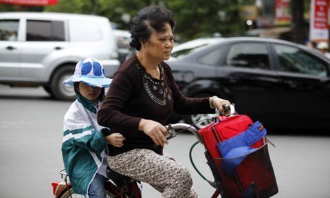 | Mẹ mặc áo cộc tay, con được quấn kín mít vì lạnh |