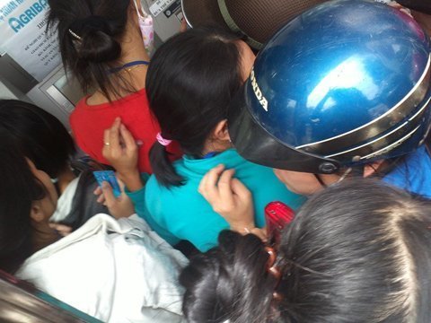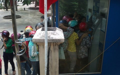 Chỉ có hơn 1m2 trong cây rút tiền nhưng có hơn chục người chen lấn như nêm cối. Bên ngoài, hàng trăm người xếp hàng, ngồi vạ vật đợi đến lượt rút tiền.
