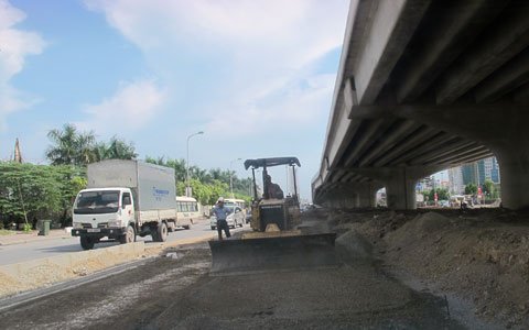 | Đường nhánh từ đường Phạm Hùng lên cầu cạn đang được cho san nền để rải nhựa. |