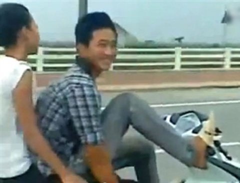 Lái xe máy bằng chân chở bạn gái (Ảnh chụp từ clip) |