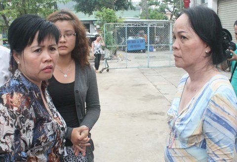| Bà Tý (bên trái) phản đối với đại diện trạm xăng dầu. |