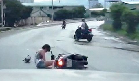 Khi đến đoạn vắng, 2 tên cướp liền tăng ga, áp sát cô gái đeo phía ngoài rồi nhanh tay giật phăng chiếc túi. Bị giật bất ngờ, cô gái ngã văng ra đường, rất may chiếc ô tô phía sau phanh lại kịp. Cô gái bị xây xát nhẹ tay và đầu gối.