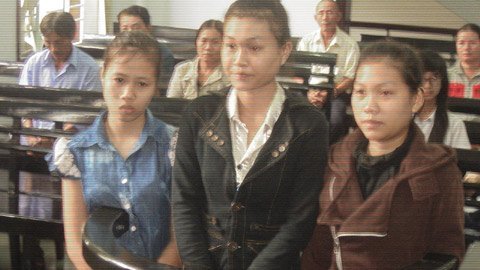 | Bị cáo Hoa, Thúy và Ngân trước vành móng ngựa. |