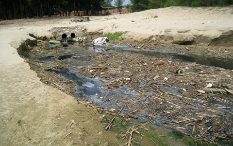 Một đường cống ngầm dài khoảng hơn 50m nối từ trong khu đầm tôm công ty ra bờ biển. Dòng nước đen kịt, đầy những cặn bã và xác tôm chết từ phía trong chảy ra. Dòng nước thải đổ ra rất lớn cuốn phăng cả bờ cát dày tạo thành một dòng kênh đen ngòm, nước đặc quánh bùn đất và rác...