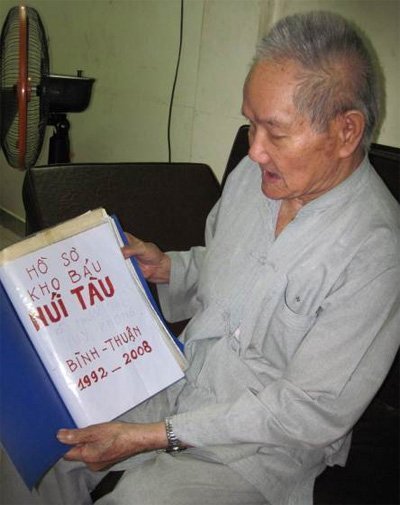 | Cụ Trần Văn Tiệp và hồ sơ về kho báu núi Tàu (Ảnh: Thanh niên) |