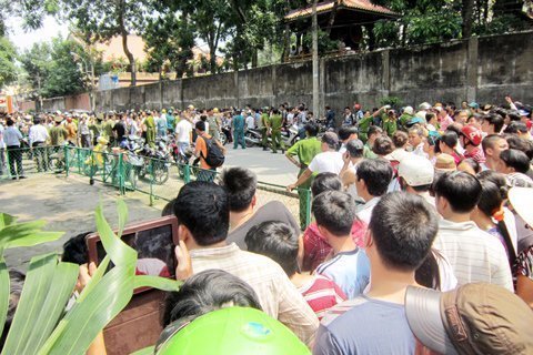 | Hàng trăm phụ huynh và người dân ngóng tin ở phía ngoài |