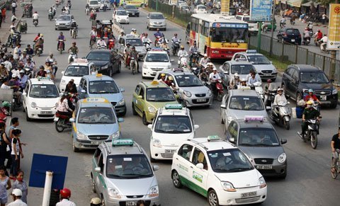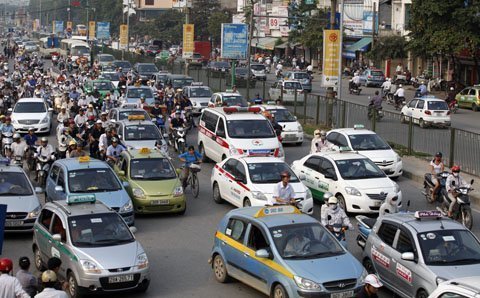 Hình ảnh taxi lộn xộn trên đường Giải Phóng, trước cổng bệnh viện Bạch Mai: