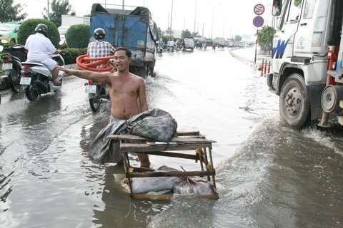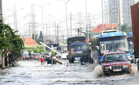 Sáng 17/10, chúng tôi có mặt trên quốc lộ 1A gần cầu An Lập (P. Tân Tạo A Q. Bình Tân TP.HCM) ghi nhận triều cường dâng cao, nước ngập trắng xóa cả mặt đường. Một người đàn ông cởi trần dầm mình dưới nước đứng bên cạnh đống bao cát dùng làm chướng ngại vật chỉ còn lú lên mặt nước vài cm, đưa tay điều tiết giao thông.