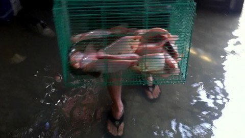 Tivi, tủ lạnh, máy giặt… và nhiều đồ dùng điện tử chỉ còn lại là đống sắt vụn khó có thể sửa chữa do ngâm nước quá lâu. Nước dâng nhanh và ngập sâu đến nỗi cá nuôi ở các ao gần đó tràn vào nhà dân. Một người dân giơ cho chúng tôi xem một lồng nuôi chim đựng đầy cá.
