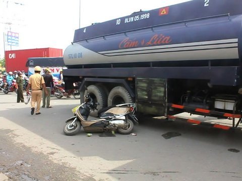 ![]() Một xe gắn máy đổ gục trước đầu xe bồn. ![]() |